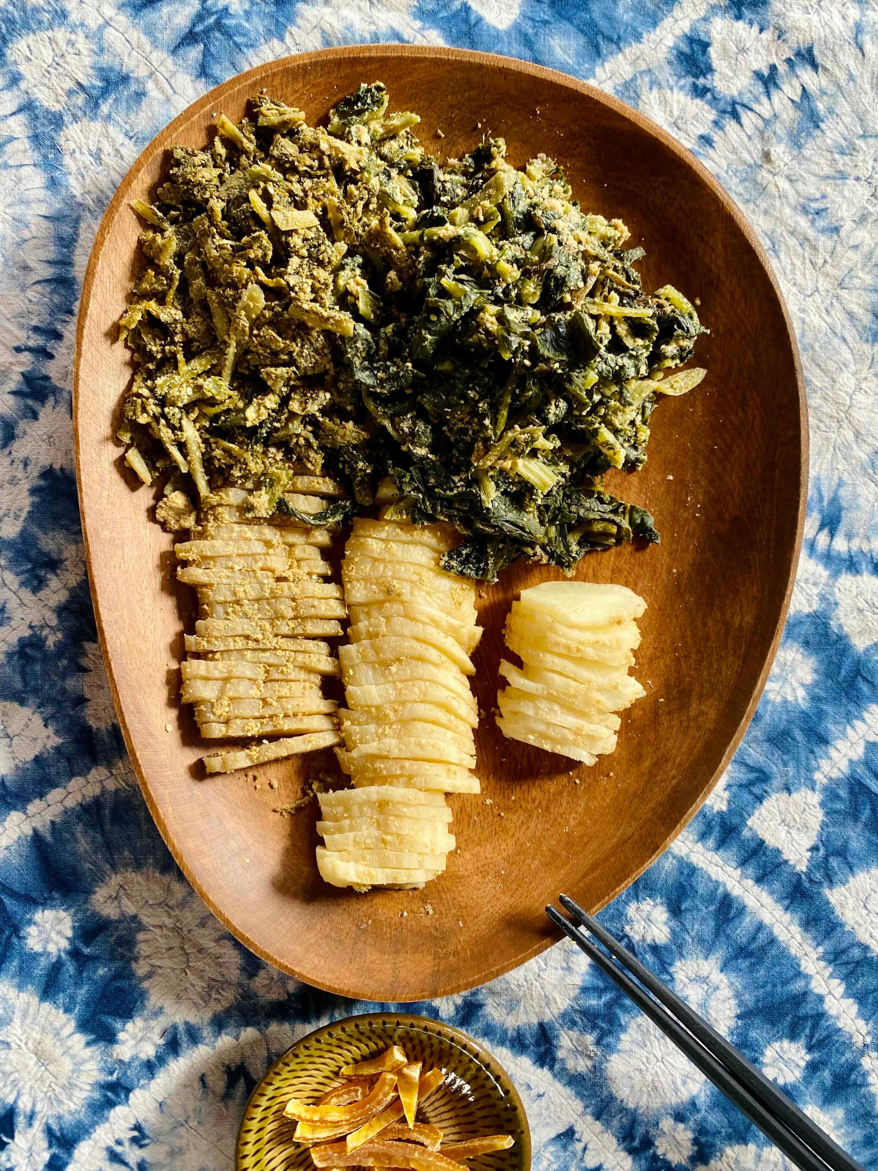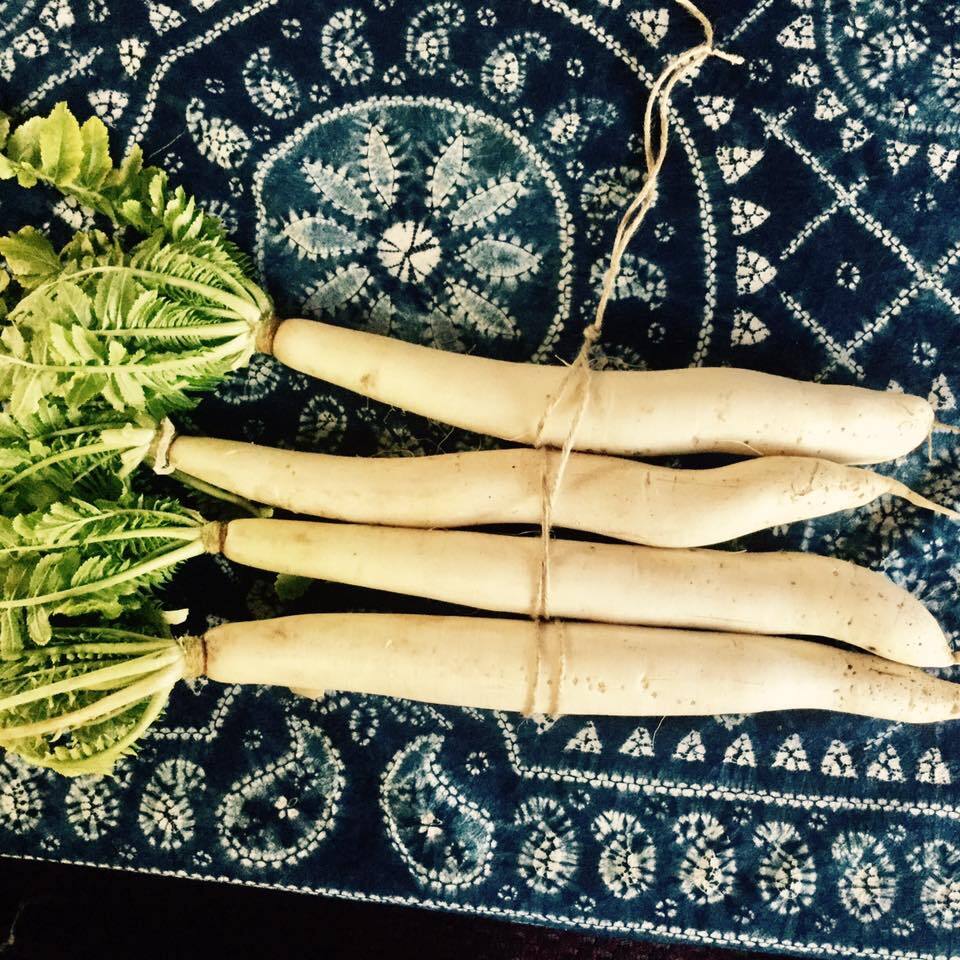 固定種の大根を20日間ほど天日干しし、米ぬか、唐辛子、柿の皮、塩で漬けました。大根、唐辛子、柿の皮は発酵農園産。米ぬかは同じ菊池市内のベテラン原農場産。全て農薬も肥料も使わない自然栽培です。塩は大気汚染や海洋汚染のない数億年前のままのモンゴルの天日湖塩です。
