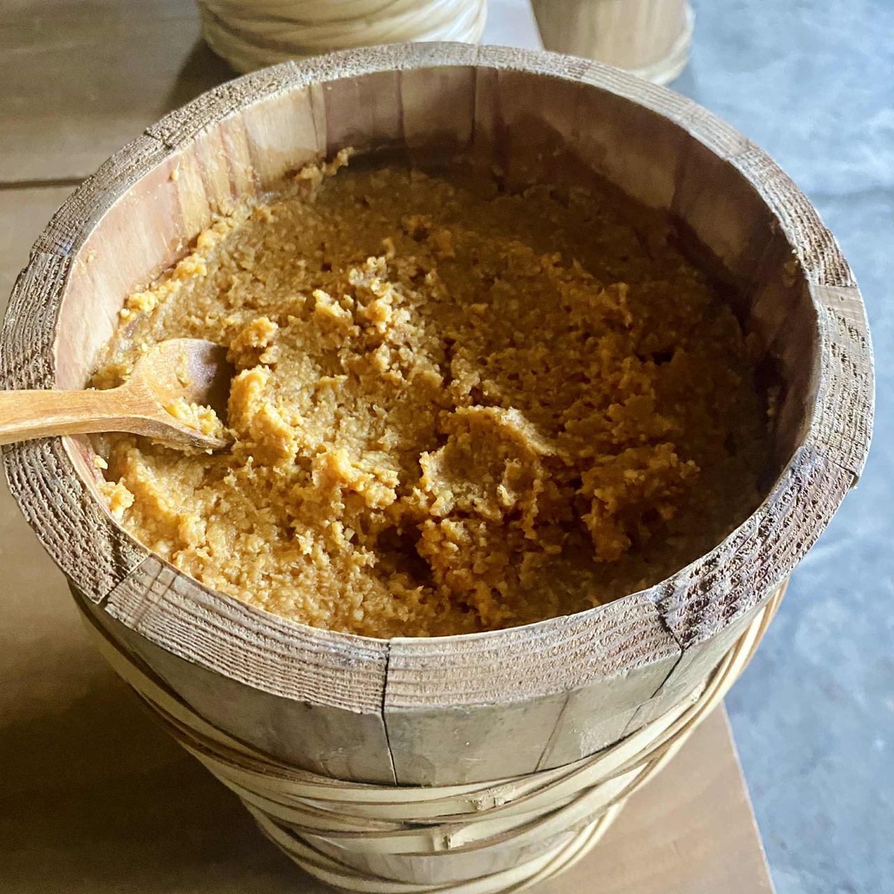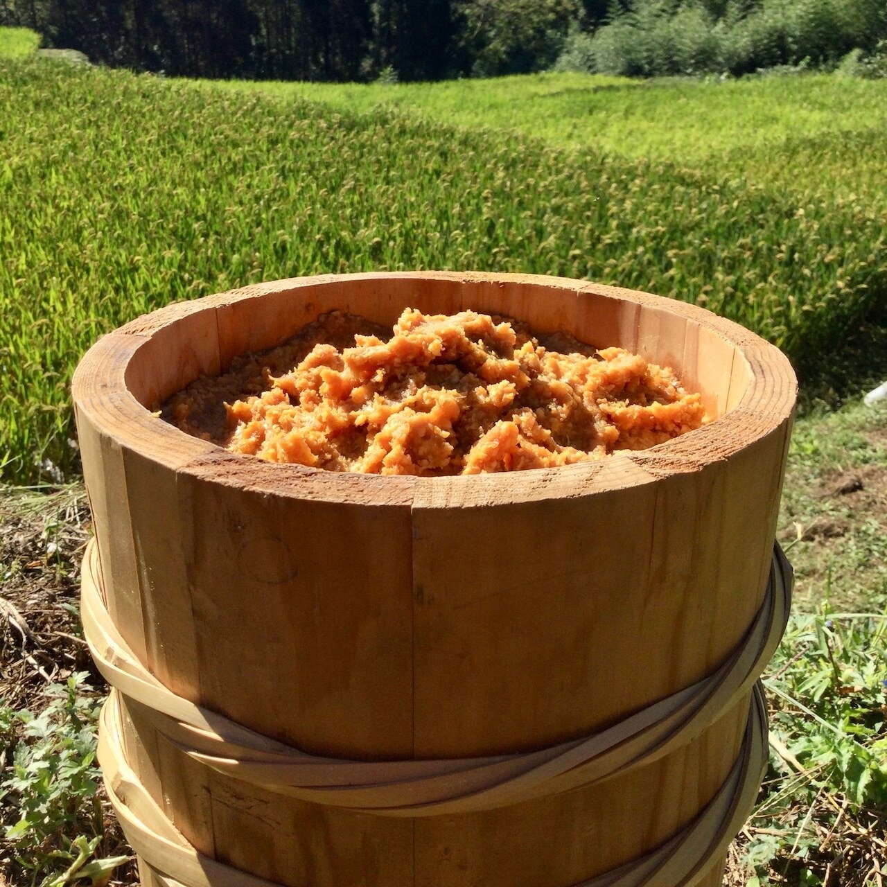 原種のお米、在来種の大豆、自然栽培の素材を使い、麹から手づくりした味噌です。薪火で仕込み、木桶で無添加天然醸造。加熱処理をしていないためお手元に届いてからも発酵を続けています。